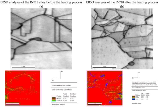 Identification by EBSD microdiffraction of carbide precipitates in the IN718 alloy before the heating process (a) and carbide precipitates and the Ni3Nb phase after the heating process (b).