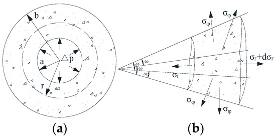 Spherically symmetric problems can be defined as those in which the geometry, constraints and external factors of an elastic body are all symmetric to the same point, resulting in all stresses, deformations and displacements being symmetric to this point. According to the characteristics of spherical symmetry, the spherical coordinates should be used with . If the symmetric point of the elastic body is taken as the origin of coordinates, the stress component, deformation component and displacement component of the spherical symmetry problem are only functions of the radial coordinates and have nothing to do with the other two coordinates. Obviously, spherical symmetry problems can only occur in hollow or solid round spheres. If the symmetric point of the elastic body is taken as the origin of coordinates, the stress component, deformation component and displacement component of the spherical symmetry problem are only functions of the radial coordinates and have nothing to do with the other two coordinates. Obviously, spherical symmetry problems can only occur in hollow or solid round spheres [32,33,34].