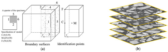 In the finite element calculation process, the initial temperature of the model was set as 10 °C in a free state without pore water pressure, and the latent heat of water-ice phase transition in the pore structure was applied to the calculation area as a distributed heat source. Furthermore, 1 and 2 are symmetry surfaces of the original specimen, 3~6 are boundary surfaces communicated with external, the temperature of which decreased gradually from initial temperature °C to the lowest temperature −20 °C within 3 h except the top face, which could be expressed by with the cooling rate 10 °C/h. The schematic diagram and two-dimensional scanning image are shown in Figure 2a with the center point C, surface point F and the intermediate point M. The hysteresis decreases with the distance from the center point C.