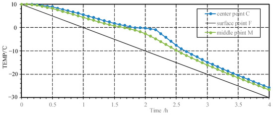 The numerical model was established with the material parameters and boundary conditions, and the temperature changes at the center point C, the half-center point M and the surface point F of the model were derived through the finite element method. As can be seen from the process diagram Figure 4, the temperature gradually decreased from inside to outside at the same time, and compared with the surface of the specimen, the temperature drop at the center point C lagged significantly.