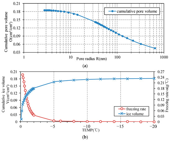 With the decrease of temperature and the influence of saturated vapor pressure, the freezing point decreases with the decrease of pore size, and ice crystal gradually forms in the larger pores firstly and further penetrates into the smaller pores in the structure. Above the capillary pore size, the solidification of the pressure water has a characteristic called super-cooling, which appears as the lower the freezing point, the greater the pressure, probably in −3 °C~−4 °C. The cementing pore size is so small with hardly a freezing point below −80 °C which suggests that the liquid has a non-freezing nature as adsorption water [28,29].
