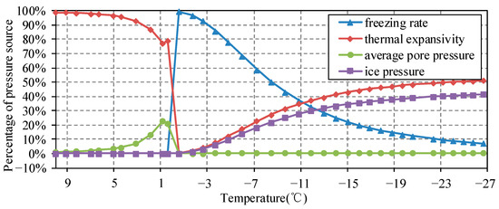 As the temperature continues to drop, the freezing rate slows down with the unfrozen water in the pores decreasing, and the pressure gradually releases as discussed in the previous section. The tension of the water-ice and linear expansion coefficient of the system gradually increase. Next, pure thermal contraction occurred as the third part of the pressure dominated. The contribution of water pressure source to the average pore water pressure is shown in Figure 6.
