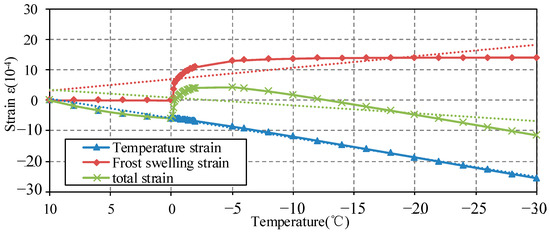 The temperature distribution was obtained from the control equation in Section 3, from which the freezing rate and ice volume in pores can be deduced. Among the sources of water pressure, the freezing rate and linear expansion coefficient of the system consist of the main factors affecting the strain. The accumulated temperature strain and accumulated frost heaving strain at the surface point F are shown in Figure 7.