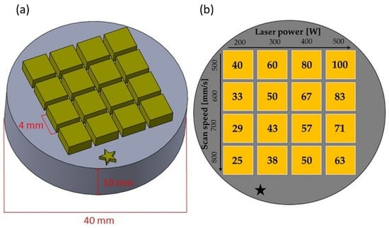 (a) CAD-model of the additively manufactured samples on the substrate plate. (b) Parameter study. The values in the yellow squares indicate the resulting volumetric energy density ( in [J/mm3]) for the respective sample.