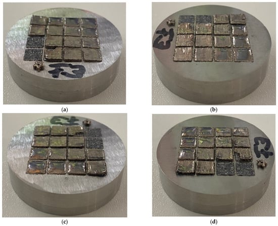 PBF-LB samples of parameter study (parameter setting detailed in Figure 3b); the star icon marks the machine front: (a) front view, (b) view from right side, (c) back view, (d) view from left side.