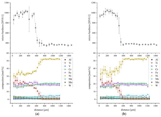 The progression of the micro-hardness was determined by a series of indentations performed on the cross-sectional cuts of the PBF-LB samples (Figure 13). In addition, EDS line scans were taken to compare the hardness gradient with the change in chemical composition, starting from the samples’ top layer through the transition zone into the substrate plate. In both cases, the reference is with respect to the distance to the top layer of each sample and parallel to the PBF-LB built direction (z-axis).