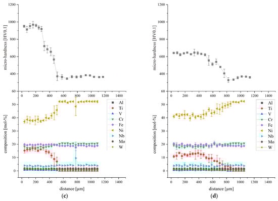 Micro-hardness and chemical composition plotted over the distance to the samples’ top surface: (a) MPEA_50, (b) MPEA_67, (c) MPEA_83, (d) MPEA_100; measuring schematic shown in Figure 13.