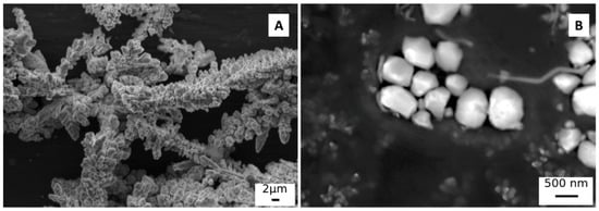 Commercial Galvalume coated carbon steel samples (55% Al, 45% Zn) were used as substrate for PEO coatings. The samples were previously degreased by ultrasonic bath in acetone for 10 min. The electrolyte used was an aqueous solution of 25 g/L of Na2SiO3 and 2.5 g/L of NaOH with the addition of 15 g/L of metallic copper particles (all chemicals from Sigma Aldrich, St. Louis, MO, USA). Two different particle sizes were tested; in particular, the particles defined as “large” are characterized by an average size of about 1 µm and the “small” particles by an average size of about 0.45 µm. A SEM micrograph of the different particles can be found in Figure 1 (Figure 1A “large” particles, Figure 1B “small” particles). The dispersion of both “large” and “small” particles in the electrolyte was good and was maintained thanks to continuous magnetic stirring of the electrolyte.
