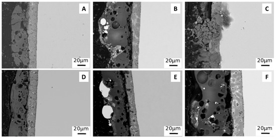 SEM images of the cross section of PEO coatings obtained working at 0.5 A/cm2 in DC mode without particles (A), with large particles (B) and with small particles (C), and working at 1 A/cm2 in UPC without particles (D), with large particles (E) and with small particles (F).