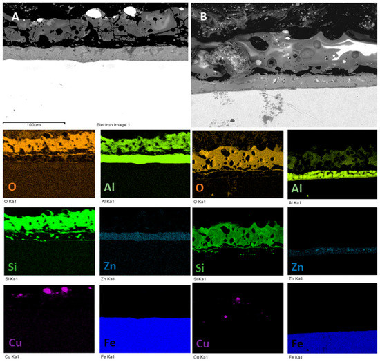 To confirm these observations and to evaluate the chemical distribution of the elements into the coatings, EDS elemental maps were performed on the most promising samples so the ones obtained with the particles in UPC mode, and the results are reported in Figure 5. The uniform distribution of Si, Al and O and the presence in the Galvalume Sub-layer of Al and Zn can be clearly noted in the PEO coated samples. Considering the copper particles, the previously reported observations can be confirmed: large particles “decorate” only the surface of the coating (Figure 5A), whereas small particles (Figure 5B) are also present inside the coatings, trapped in the discharge channels.