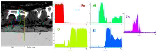 In order to also evaluate the composition and the thickness of the ZA layer and to study the interface between the ZA layer and the PEO coating, EDS line analysis was performed and the results obtained in the sample produced at 1 A/cm2 in UPC with small particles are reported in Figure 6. First of all, it can be noted that the ZA layer is composed almost equally by Zinc and Aluminum and the thickness of the layer is around 20 microns. The resulting PEO layer is instead composed mainly of Al, Si and O with the Zinc not contributing significantly in the formation of the coating. Considering the interface between the ZA layer and the PEO coating, a decrease in the aluminum in comparison with the PEO layer can be observed. Therefore, at the interface, there is a concentration in the silicon content with the aluminum that increase instead in the external part of the coating. This is probably related to the fact that silicon oxidation occurs before that of aluminum, causing an increase in the silicon oxide content at the interface between the ZA layer and the PEO layer.