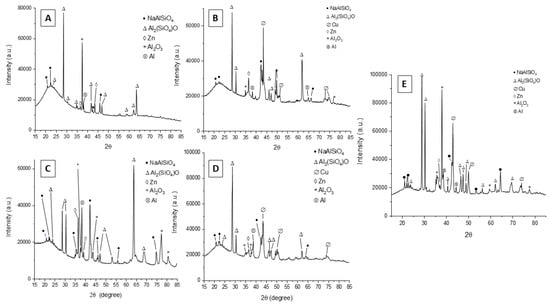 To identify the various phases, present within the coating, XRD analysis was also performed, and the results are reported in Figure 7. From the spectra, it can be seen that the coating consists mainly of aluminum oxide (Al2O3) and aluminosilicates (Al2SiO5 and NaAlSiO4). There are also clearly present peaks of copper, relative to the particles in the samples obtained with the particles, and those of Al and Zn, relative to the underlying Galvalume coating. The composition of the obtained coating resulted in accordance with the ones of the electrolyte and of the substrate and is also confirmed by results previously obtained in the literature [24]. XRD spectra of the sample obtained at 0.5 A/cm2 in DC with small particles are not reported due to failure of the coating. From the comparison between the different samples, no significant differences can be observed in terms of phase composition.