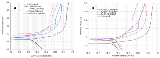 Results of potentiodynamic polarization tests (PDP) performed on the samples produced without particles and with “large” particles (A) and of the samples produced with “small” and “large” particles (B). Test electrolyte: 0.1 M Na2SO4 and 0.05 M NaCl.