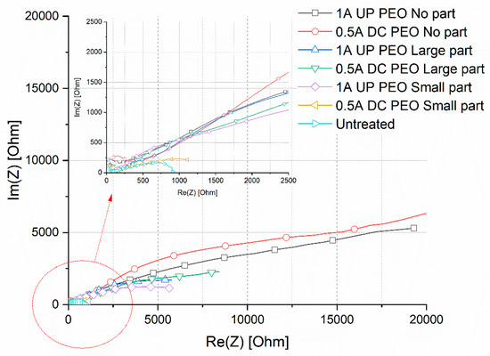 In the Nyquist plot reported in Figure 9, the real part of the impedance at low frequencies can be considered as qualitative indication of the corrosion properties of the sample. Considering this, it can be clearly noted that the EIS results confirm the indication given by the PDP tests. First of all, it can be clearly noted that all the PEO treated samples are characterized by improved corrosion properties in comparison with the untreated one. The sample with the lower corrosion properties was, in fact, the one 0.5 DC with small particles, in which the PEO coating was not completely formed, whereas the best corrosion properties are obtained on the samples without the copper particles. All the samples obtained with particles (expect for the one 0.5DC small particles) are characterized by similar corrosion resistance, lower than the one of the samples without particles, due to the galvanic couple caused by the presence of copper. The qualitative indication obtained from the observation of the Nyquist plot is also confirmed by the results of the fitting of the experimental data reported in Table 2. Considering this data, first of all, it can be observed in all the samples, as typical for PEO coatings, that the value of RB is higher than the one of RP, due to the increased corrosion properties of the barrier layer. The value of RB for the samples treated without particles (1A UP and 0.5 DC) was around 30,000 ohm cm2, whereas the one of the samples treated with the particles was around 10,000 ohm cm2, confirming the reduction in the corrosion properties due to the galvanic couple between the copper and the aluminum substrate. Excluding the sample 0.5DC small particles, characterized by a value of RB around 1000 ohm cm2 due to incomplete coating formation, the sample with the lower value of RB was the one 1A UP with small particles (9126 ohm cm2). This can be linked with the SEM observation where the sample 1A UP with small particles was the one with the higher amount of incorporated particles and so with higher problems of galvanic coupling. In all the PEO treated samples, the polarization resistance was higher than the one of the untreated sample, characterized by the presence of only the natural oxide layer (950 ohm cm2).