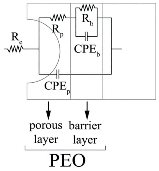 The equivalent circuit was chosen on the basis of the literature on PEO coatings [32] that suggests to employ a double circuit (Figure 10) to fit data coming from PEO treated samples. In particular, this permits consideration of the presence of an inner and an external layer, called, respectively, barrier layer and porous layer. A good fitting quality was obtained, as confirmed by the low values of chi-squared in Table 2 and by the good correspondence between dots and lines in Figure 9. The untreated sample was instead fitted using a simple Randles circuit in order to consider the presence of the natural oxide layer. Considering the physical meaning of the different elements of the equivalent circuits in Figure 10, Re represents the resistance of the electrolyte, Rp and CPEp represents the porous layer of PEO coating, and Rb and CPEb the barrier layer. CPEi (Constant Pahse Elements) were used in the equivalent circuits instead of capacitances due to the fact that the measured capacitance is not ideal. The impedance of a CPE has the form: