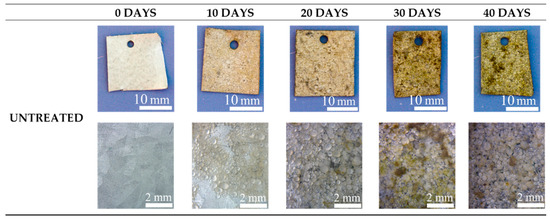 Visual observation (on the upper part) and stereo-microscope observation (on the bottom part) of the untreated samples after 0, 10, 20, 30 and 40 days of immersion in circulating seawater at the Hydrobiological Station Umberto D’Ancona.