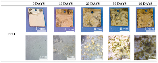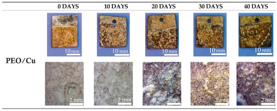 The antifouling properties were evaluated by immersing the samples in circulating seawater for 40 days and analyzing the surfaces after each 10 days. In Figure 11, Figure 12 and Figure 13, the visual and the stereo microscope observations of the immersed samples after different immersion times are reported. In particular, in Figure 11, the untreated sample is reported, in Figure 12, the PEO treated sample (1A UP without particles), and in Figure 13, the sample PEO treated with the presence of copper particles (1A UP with small particles). The immersion tests were performed on the sample 1A UP with small particles; from the previously reported observations, this was in fact the one with the higher number of incorporated particles, and so the more promising in terms of antifouling properties. In fact, as reported in the literature [24], the quantity of the antifouling agent plays a key role in the colonization. For comparison reasons, the immersed sample without particles was the corresponding one, 1A UP without particles. Considering the untreated sample (so the one with only the ZA layer, Figure 11), already after 10 days of immersion, a remarkable colonization can be clearly observed and after 40 days almost all the surface resulted covered. Moreover, remarkable corrosion phenomena can be noted with the presence of evident cavities on the surface already after 10 days. The PEO coatings without particles (Figure 12) do not reduce the fouling phenomena that instead were increased, as can be observed by the presence of bigger green zones in the surface after 40 days of immersion. This fact was in accordance with previous work of the authors [25] and is linked with the surface morphology of the PEO layer. As was also observed in the SEM analysis, the surface of PEO coatings is, in fact, porous and in these pores, the algae can grow faster. Instead, no remarkable corrosion phenomena can be observed on the surface, even after 40 days of immersion, thanks to the protection given by the PEO layer. Considering the sample PEO treated with the copper particles (Figure 13), a remarkable antifouling effect of the copper particles during the first 10 and 20 days of immersion can be observed. In fact, after 10 and 20 days, no colonization is observable. After 30 and 40 days, the colonization seems to start also in the sample PEO treated with the copper particles, probably due to the fact that the complete coverage of the surface of the samples by the biofilm significantly reduces the antifouling effect of the copper particles present in the PEO underlayer. Furthermore, the corrosion properties of the samples PEO/Cu were good with no evidence of corrosion phenomena even after 40 days. Considering both these facts, the PEO coating with copper particles can be considered as promising pre-treatment for antifouling paints on steels. In fact, the PEO layer will protect from corrosion in presence of scratches of defects in the varnish and the presence of the copper particles will assure the antifouling properties, at least during the first days of immersion before that proper maintenance can be performed. Moreover, the porous morphology of the PEO surface make it particularly suitable for increasing the mechanical bond between the metal and the organic coating.