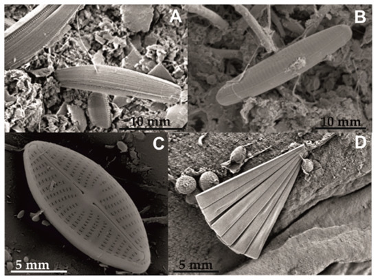 Scanning electron micrographs showing some diatoms found in the samples. (A) Amphora sp., bar = 10 µm; (B) Navicula sp., bar = 10 µm; (C) Navicula sp., bar = 5 µm; (D) Licmophora sp., bar = 5 µm.