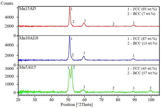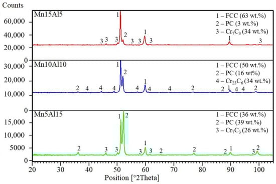 26]. This illustrates the significant influence of the PC phase and carbides whose mutual fraction increased within the compacts with the content of Al. More importantly, the hardness of the Mn5Al15 alloy was significantly higher than the 352 HV of the equiatomic quinary single-phased CoCrFeNiMn alloy prepared using the same experimental setup reported in [