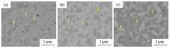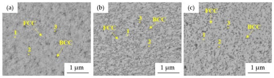 In addition, the phase composition of the alloys did not change through annealing, remaining almost identical to those previously reported for the as-compacted samples. The results of the SEM + EDS analysis of the chemical composition of the points marked in