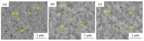 Table 4, confirming the presence of the FCC, PC and carbide phases. Therefore, apart from the microstructural coarsening, the phases’ chemical compositions remained the same.