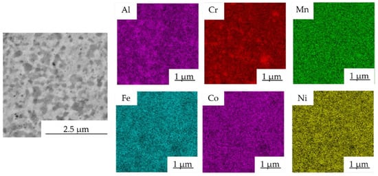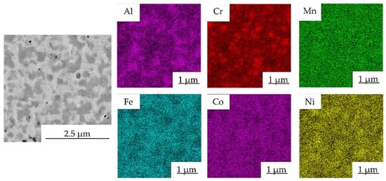 Figure 13 and, according to the results of SEM + EDS point analysis, proved the presence of areas enriched in Cr and areas with a higher concentration of Al. When compared with the element maps of the as-compacted alloy (