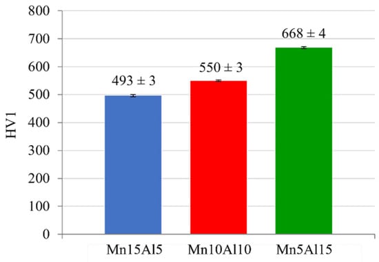 Figure 9, the prepared alloys showed a strong dependence of their hardness on the actual chemical composition. Increasing the content of Al resulted in an increase in the hardness from starting at 493 ± 3 HV 1 (Mn15Al5) and going up to 668 ± 4 HV 1 (Mn5Al15). This value is even higher than that of the quinary equiatomic CoCrFeNiAl alloy prepared using the same techniques reaching only 646 HV [
