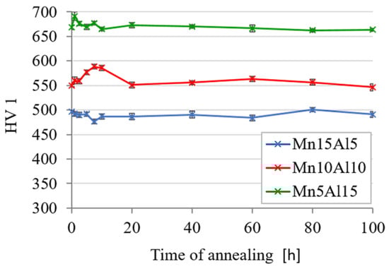 Figure 11, all the tested alloys showed exceptional stability since they retained their initial hardnesses. Moreover, the Mn10Al10 alloy showed during the first 10 h of annealing a hardness increase, likely caused by the increasing formation of the carbides and their growth, showing similar behavior to the CoCrFeNiMnAl alloy annealed at a temperature of 1400 K (1126.85 °C) as reported in [