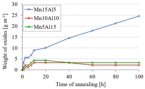Figure 14, the Mn15Al5 alloy showed a sort of parabolic kinetics of oxidation, which is known for rapid weight gain in a matter of minutes and slowing down over time due to the diffusion-driven character of oxygen transport through the developing oxide layer. However, as the annealing prolonged, the oxidation kinetics showed rather a linear mechanism according to the weight gains, suggesting the poor protective behavior of such layer due to, e.g., cracking or formation of pores within the layer. On the other hand, increasing the Al content resulted in logarithmic kinetics of oxidation, suggesting the creation of a dense protective layer, which did not tend to chip off over the time of annealing. Both the Mn10Al10 and Mn5Al15 alloys gained less than 5 g m