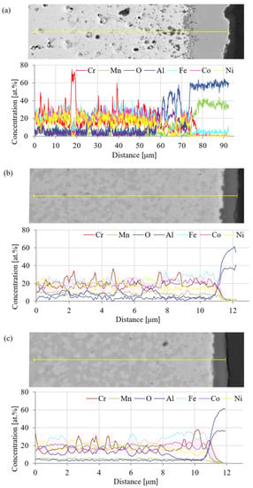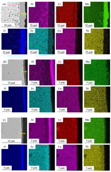 Figure 16. These analyses confirmed the above-made presumptions, e.g., that the oxide layer of the Mn15Al5 alloy is mainly composed of one type of Mn-based oxide accompanied by an increased content Fe within it, which is highly likely to form a complex oxide. As the line analysis moves closer to the metal/oxide interface, the content of Cr steeply increases and is accompanied by O, confirming the above-made presumption based on the formation of a Cr-based oxide interlayer. In comparison, the remaining MA + SPS showed the presence mainly of Al within the oxide layer without any traces of the formation of sub-layers on the metal/oxide interface. Both the alloys showed a certain depletion of Al reaching ≈2.5 µm deep into the alloy.