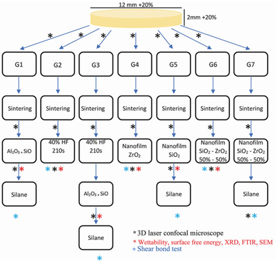 The surface free energy and wettability data were analyzed by nonparametric Kruskal–Wallis and Dunn tests. The surface roughness and dynamic modulus data were analyzed using a linear model of mixed effects because of intragroup (presintering, postsintering, and post-treatment) and intergroup (silicatization to SiO2+ZrO2/Silane) comparisons. Multiple comparisons were made by orthogonal contrasts using PROC GLM from SAS version 9.3 (SAS Institute Inc. (Cary, NC, USA)). The shear bond strength data were compared by one-way analysis of variance (ANOVA) and the Tukey test. To analyze whether there was an association between the failure types and the groups, a chi-square test was performed. A significance level of 5% was used.