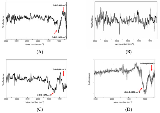 ATR-FTIR spectra of specimens after surface treatments: (A) silicatization; (B) HF; (C) HF/silicatization; (D) SiO2/Silane.