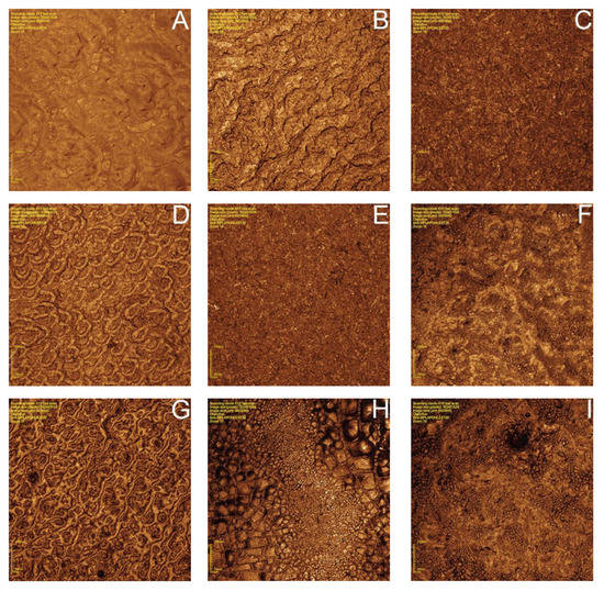 Images of the surface morphology of the disks in different experimental conditions (432× magnification): (A) before sintering; (B) after sintering; (C) silicatization; (D) HF 40%; (E) HF 40% + silicatization; (F) ZrO2 nanoparticles; (G) SiO2 nanoparticles; (H) ZrO2 + SiO2 nanoparticles (50%–50%); (I): ZrO2 + SiO2 nanoparticles (50%–50%) + silane.