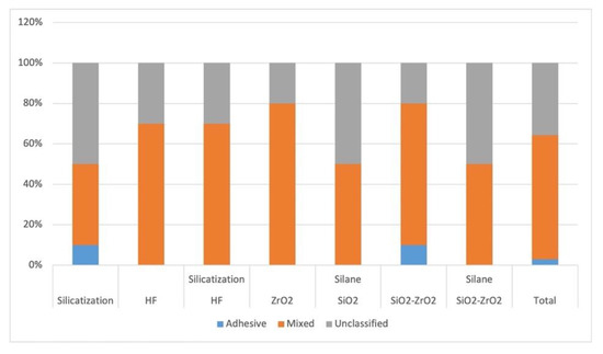 Analyzing whether there was an association between the failure types and the groups using the chi-square test, there was no association between these variables (p = 0.569). Mixed failures were due to the characteristics of the dual resin cement used, which was composed of MDP with metal oxide affinity as ZrO2 [20,32,35,36,50,54]. The chemical bond of the resin cement probably occurred due to the MDP action over the nanoparticles of Zr deposited or over the Y-TZP surface, forming P-O-Zr covalent bonds [48].