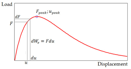 In physical terms, Equation (2) models the state of the specimen at time , when the material strain and stress change by and , respectively (or displacement and load change by and , respectively). To analyze the state of the material at any time interval using the differential fracture criterion, a complete load–displacement (or stress–strain) curve equation is needed, but integrating this equation to calculate energy is not required.