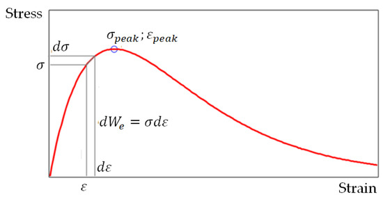 During loading, the weakest particles of the brittle material and particle–particle junctions collapse gradually, so that the load is redistributed over the not yet collapsed particles; therefore, the stress in these particles increases, but the number of undestroyed particles decreases, and in the post-peak state the bearing capacity of the sample decreases. Since weak particles are the first to collapse when the load increases, and the modulus of elasticity and strength correlate positively, it is reasonable to assume that the modulus of elasticity of the material of the undestroyed particles tend to increase. In contrast to an ideal material, in a real brittle material only part of the input energy is stored in the form of potential strain energy, the other part of the input energy is dissipated, which is modeled by Equation (3) and shown in Figure 4.