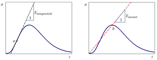 It is possible to draw infinitely many tangents to the curve in question. The angle of inclination of each of these tangents can be considered as the tangential modulus of elasticity. However, only point a on the ascending branch corresponds to the state in which the tangential modulus of elasticity reaches the highest values, because the condition of extremum of the function is satisfied at this point: . From the physical point of view, the maximum value of the tangential modulus of elasticity is explained by the closure of cracks at a certain value of load, i.e., the real material at this stage of deformation is transformed into an almost ideal linearly elastic material. Therefore, if we compare a real brittle material at the model level with an imaginary ideal material without cracks, the tangential modulus of elasticity of the real material should be chosen as the modulus of elasticity of the ideal material (Figure 3).