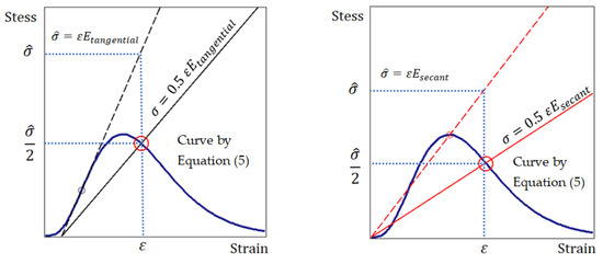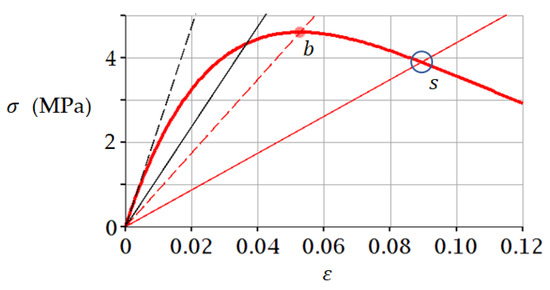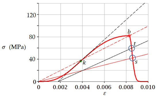 Figure 5 shows that failure occurs at the point where curve (5) crosses the line or . The stress is determined by Equation (5) depending on the strain ; the tangential modulus of elasticity is determined taking into account the remarks in Figure 3. Thus, the use of the tangential and secant modulus of elasticity provides an interval of possible values of the fracture criterion. However, if there is no inflection point on the ascending branch of the stress–strain curve (Figure 2), only the secant modulus of elasticity is used.