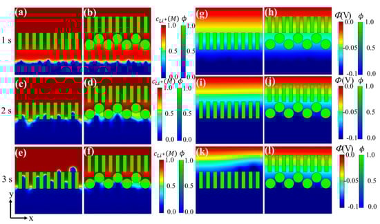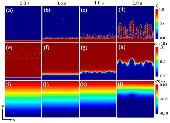 During the charging process, the evolution of the phase-field variable, the Li+ concentration, and the electric potential are shown in Figure 1. After an electrodeposition process of 0.6 s (Figure 1b,f,j), the roughness of the interface occurred obviously. With formation of small nuclei at the interface, the tip region had a slightly higher concentration than the valley region. Further growth of these nuclei led to the formation of long dendrite-like patterns (Figure 1c,d). The difference between the Li+ concentration surrounding the dendrite tips and valley regions continued to grow (Figure 1g,h), since the Li+ diffusion paths of dendrite tips were shorter than that of the valley regions []. This distribution further promoted Li deposition on the dendrite tips. With dendrite growth, the electric potential near the dendrite tip was lower than the surrounding valley region (Figure 1l); thus, there appeared a transverse component for the electric field, which facilitates Li+ transport from both the electrolyte and valley regions to the dendrite tips and further promotes dendrite growth []. The simulation results are in good agreement with experiments and thus show the validity of the electrochemical phase-field model above.