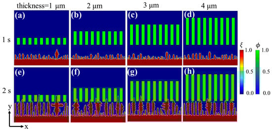 Phase-field simulation of Li deposition under separators with different thicknesses: (a–d) phase-field variable at 1 s, (e–h) phase-field variable at 2 s.