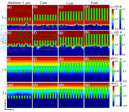 Phase-field simulation of Li deposition under separators with different thicknesses: (a–d) Li+ distribution at 1 s, (e–h) Li+ distribution at 2 s, (i–l) electric potential at 1 s, (m–p) electric potential at 2 s.