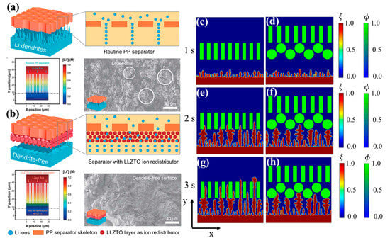 Schematics, ionic distribution, and SEM images of Li metal anodes using (a) PP separator and (b) LLZTO coated PP separator []; simulation results of phase-field variable under (c,e,g) single layer separator and (d,f,h) coated separator.