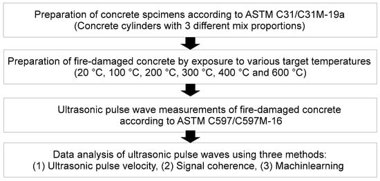 This section describes the experimental methods used in the study to obtain the necessary time-series data for the analysis. In general, the study followed the flowchart shown in Figure 1. Concrete cylinder specimens were prepared and then subjected to different temperature levels to represent different degrees of thermal damage. After thermal exposure, ultrasonic pulse waves were measured.