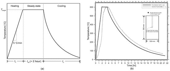 Temperature-time history used for this research: (a) programmed temperature-time history for heating electric furnace, (b) measured temperature in the air of the furnace and the core of a concrete cylinder for the target temperature of 600 °C. Note that th is defined as the time it takes to reach the target temperature, tss is the time when the temperature is sustained at Ttarget (target temperature for this study, lasts for 2 h), and tc is the time it takes to naturally cool down to room temperature.