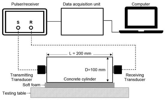 Figure 3 illustrates the test setup of ultrasonic pulse wave measurements transmitted through a concrete sample. The standard test procedure according to ASTM C 597/C597M-16 [52] was used to assess the P-wave velocity (constrained compressive velocity) of concrete cylinders that were subjected to different target temperatures. The room temperature during the ultrasonic pulse wave measurements was maintained at around 20 °C to 25 °C throughout the experiment. The study used a pair of transducers with a center frequency of about 50 kHz that can transmit and receive ultrasonic pulses (see Figure 3). Using a pulse-receiver (Panametrics 5077 PR, Tokyo, Japan), a 200 V square pulse with a duration of 10 µs was used to drive the source transducer (Olympus, Tokyo, Japan). First, the concrete surface was wiped with a wet cloth to remove dust. Next, the standard coupling agent was applied on the contact surfaces of the concrete and transducers to minimize impedance mismatch in the ultrasonic pulse wave measurements. Furthermore, the transducers were firmly pressed to minimize the air gaps in the concrete and transducer interfaces. The receiving sensor recorded transient stress waves that were created by the source sensor and propagated through the concrete. It took a couple of seconds to obtain stable signals after starting the ultrasonic pulse wave measurements. The receiving signals were digitized by a high-speed digital oscilloscope (NI-PXI 5101, Austin, TX, USA) with a total signal length of 0.001 s at a sampling rate of 10 MHz after the measured ultrasonic signals became stable. In this study, pulse data were collected ten times on each cylinder and were averaged to improve signal-to-noise levels of the measured data. The averaged ultrasonic data was transferred to a laptop computer for data storage and post-processing.