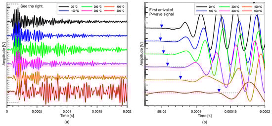 Typical time signals of ultrasonic pulse waves propagating through the thermally-damaged concrete cylinders under different target temperatures: (a) ultrasonic waves at different target temperatures and (b) enlarged ultrasonic signal around the first arrival of the wave shown in (a).