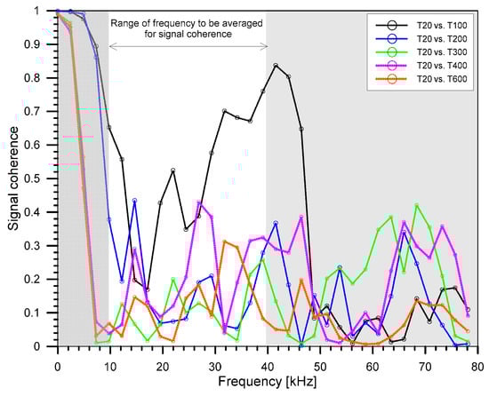 As can be seen from the equation, assessing the coherence between concretes with and without fire damage requires a baseline value. To obtain the coherence values in this study, signals were initially collected on specimens with and without fire damage. A subset of the time-domain signals was then chosen, and each signal was converted into power spectral density using FFT. The coherence was computed from the converted signals using MATLAB’s ‘mscohere’ function [53]. The coherence value is averaged within a certain frequency frame in this investigation so that the outcome may be reported as a single number and analyzed with temperature variations. In this study, the tail end of the ultrasonic wave signal was used (shown in Figure 4 as the signal enclosed inside the dashed box). Figure 5 illustrates the frequency used for this study in averaging the coherence of the time signals from the concrete. The primary wave going through the concrete is captured in the first half of the signal. The reflected signal towards the tail end of the transmission, however, has a lower amplitude because of energy absorption. So far, there are still no standards on what ‘window’ should be used for averaging nonlinear properties. Therefore, the coherence averaging approach, like other nonlinear methods, still clearly requires engineering judgment. For this analysis, the ultrasonic signals from the different temperatures were each compared to the signals from the normal temperature condition (20 °C vs. 100 °C, 20 °C vs. 200 °C, 20 °C vs. 300 °C, 20 °C vs. 400 °C, and 20 °C vs. 600 °C).