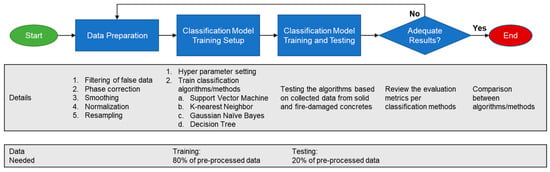 In this study, machine learning was used to classify the thermal damage of the concrete specimens that were exposed to different temperatures. The different machine-learning methods used for this study are summarized in Table 3. The data used for the analysis was from the ultrasonic waves of the UPV measurement.