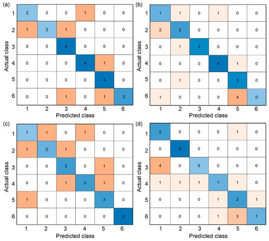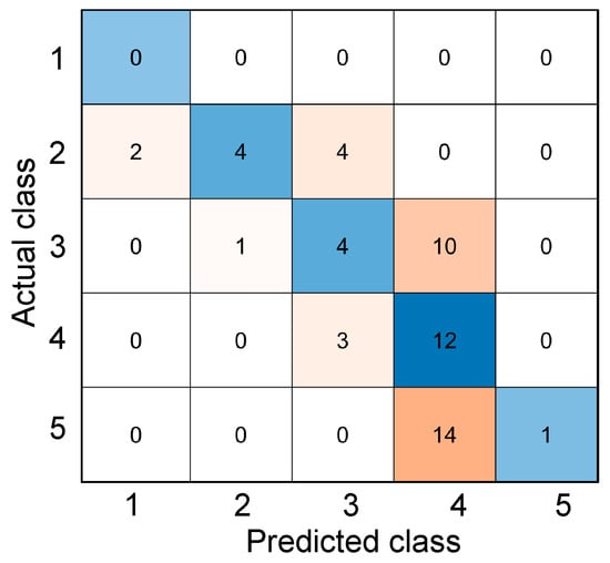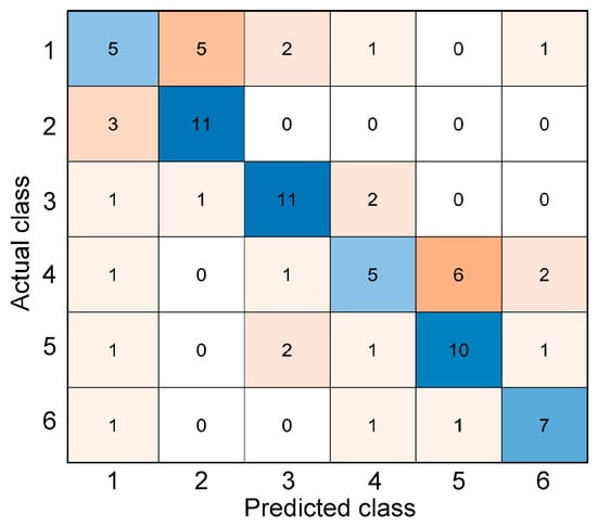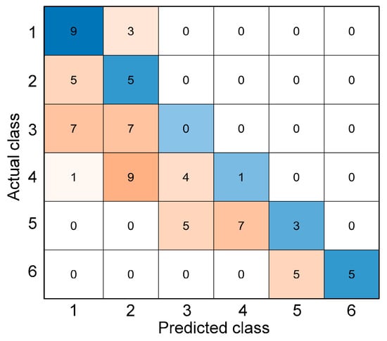 where Vp is the P-wave velocity in m/s and T is the exposure temperature in °C. The use of a linear parameter of the ultrasonic wave showed that exposure of concrete cylinders to relatively low temperatures did not affect the P-wave velocities significantly. It can be seen from the graph that there is a gradual decrease in the P-wave velocity in the early exposure to fire, until the temperature of 300 °C. From this temperature until 600 °C, a sudden decrease can be observed. Values of P-wave velocity are also fluctuating between the range of 20 °C to 300 °C. For this parameter, six classes were also established from the ranges of temperatures—class 1 for P-wave velocities when the temperature is T < 50 °C (Vp > 4128 m/s), class 2 for 50 °C ≤ T < 150 °C (4033 m/s < Vp ≤ 4128 m/s), class 3 for 150 °C ≤ T < 250 °C (3783 m/s < Vp ≤ 4033 m/s), class 4 for 250 °C ≤ T < 350 °C (3379 m/s < Vp ≤ 3783 m/s), class 5 for 350 °C ≤ T < 450 °C (2821 m/s < Vp ≤ 3379 m/s), and class 6 for T ≥ 450 °C (Vp ≤ 2821 m/s). This classification system is also visualized in Figure 8b. Figure 9 shows the confusion matrix from the results of classifying after using Equation (9) in predicting the corresponding temperature and consequently classifying to specific classes. This method of using the equations derived from the P-wave velocities of the experimental data yielded an accuracy of 30.26%. It can be seen that the relatively low accuracy is caused by fluctuating trends of P-wave velocity measurements, especially for concrete specimens exposed at lower temperatures (≤300 °C).