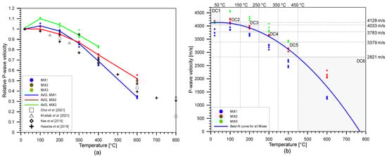 Variation of (a) relative P-wave velocities from the experimental data of this study and the literature with increasing temperature and (b) labeled P-wave velocities. Note that DC in (b) means damage class of concrete.